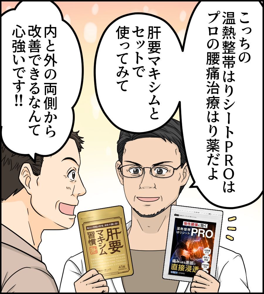 今まではマッサージなどよく通っていましたが3日後には元通りでした。肝臓が原因とは本当に驚きました…。コレを飲んで、はりシートも使ってピタッと気持ちよくなってほしいね。周りにも腰で悩んでいる人が多いのでぜひおススメしようと思います!