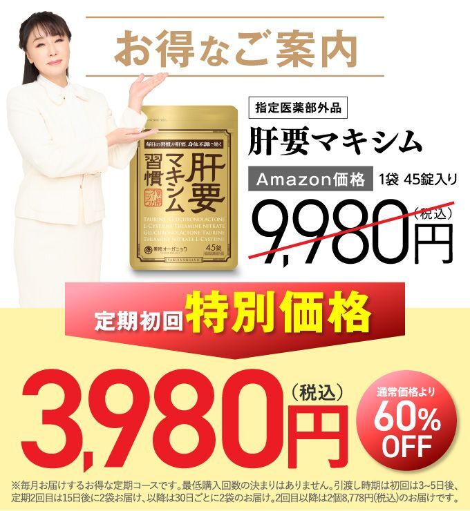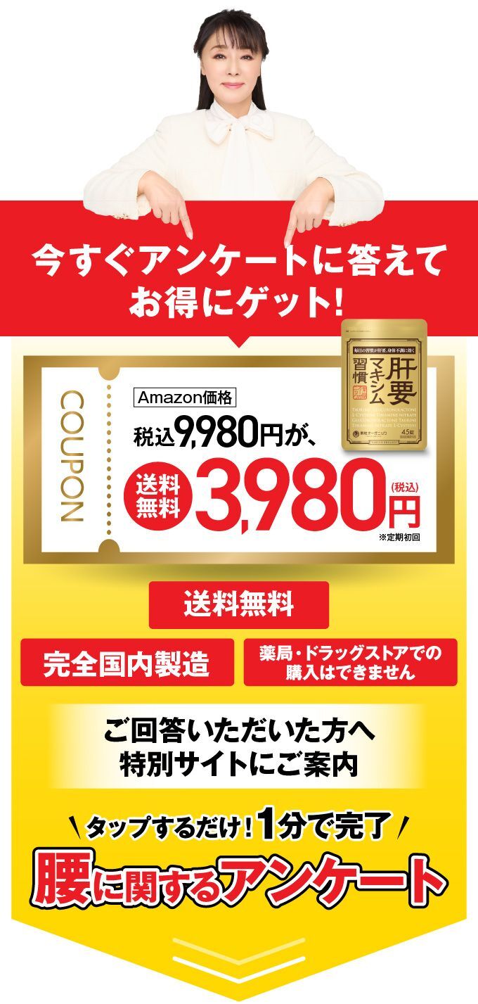 毎日お酒を飲んでいるので、 ツラい腰の原因が肝臓にあると知って、ドキッとしました。肝臓に毒素がたまっている気がしていたので、肝要マキシムに出会えて嬉しいです。